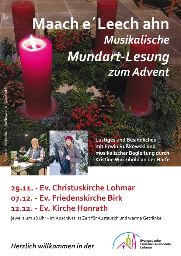 In seinem neuen Buch „Maach e‘ Leech ahn“, das in der rheinischen Mundart geschrieben ist, widmet er sich mit Gedanken, Gedichten und Geschichten dem Thema Advent und Weihnachten. Bei den Lesungen können sich die Zuhörer*innen auf einen unterhaltsamen´, lustigen aber auch zum nachdenken anregenden Abend freuen. Die musikalische Untermalung wird von Kristine Warmhold an der Harfe begleitet.