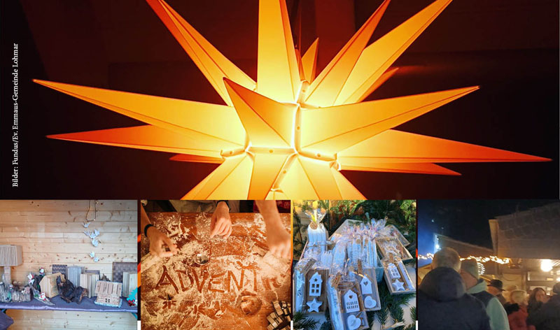 Freuen Sie sich / freut Euch auf unser kulinarisches Angebot in der Cafeteria in den unteren Räumlichkeiten, auf dem Außengelände mit Food Truck, Reibekuchen und frischem Angebot aus Wildfleisch und auf unseren selbstgemachten „Honrather Glühwein“, liebevoll selbsterstellten Bastel- und Handarbeiten, Bücherflohmarkt, Kinderprogramm (bis 17.00 Uhr) sowie um 19.00 Uhr weihnachtliche Musik von den Naafbachtaler Stubenhockern vor dem Gemeindehaus.